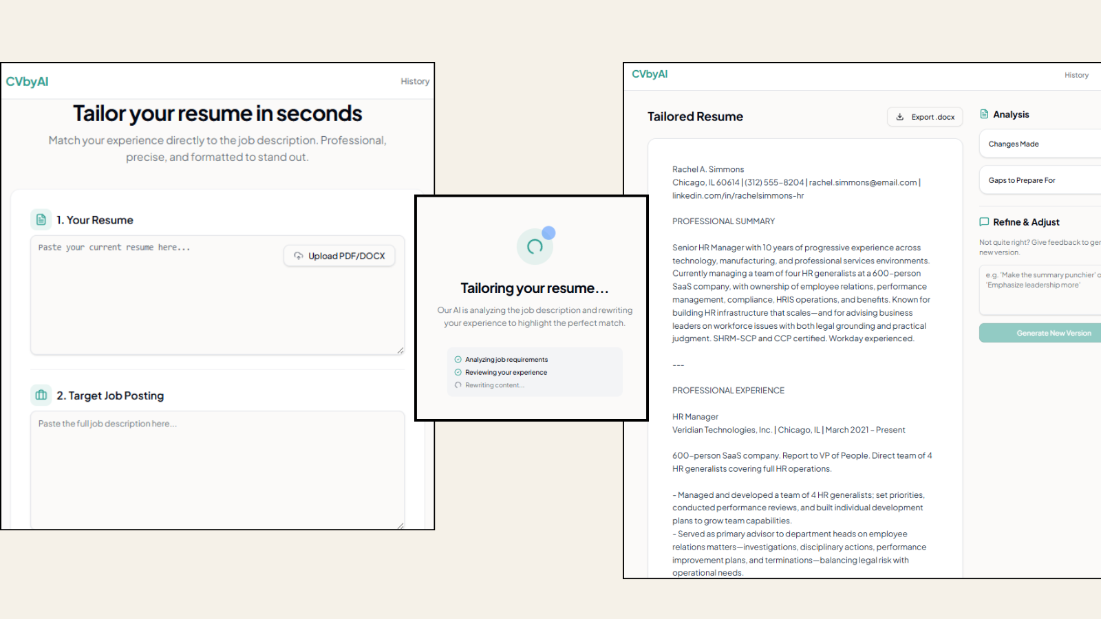 The output is always the same: a finalized resume, tailored to the candidate and the role.