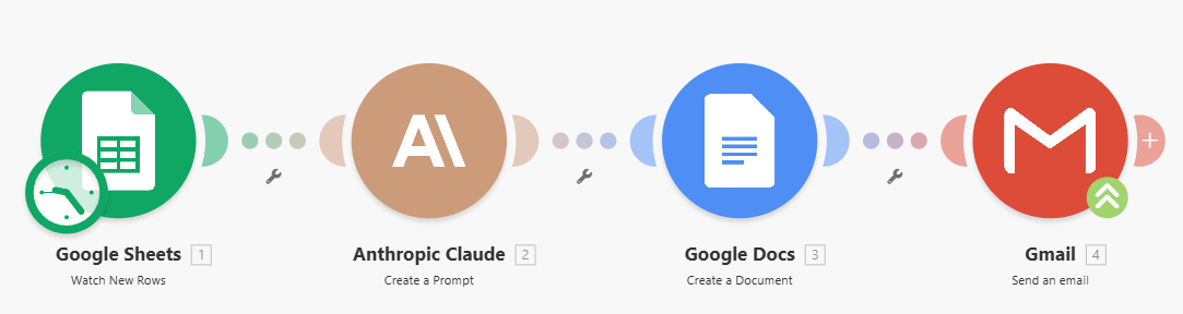 So you build a workflow. You start with the “trigger”. In this case, let’s say the whole thing kicks off when someone submits their request and information on your website’s Google Form. The workflow (called a “Scenario”) starts, because you told it to take action when a new submission is seen. In this case, it’s a new line added to the Google Sheet where the submissions are stored.
